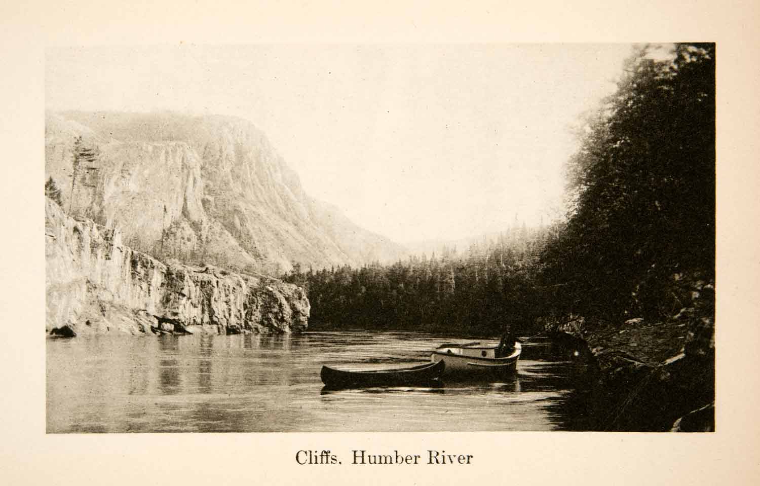 This is an original 1926 black and white photogravure of the cliffs near the Humber River which is located in the province of Newfoundland and Labrador in Canada. The Humber flows 120 km from the Long Range Mountains to the Bay of Islands in the Atlantic Ocean.