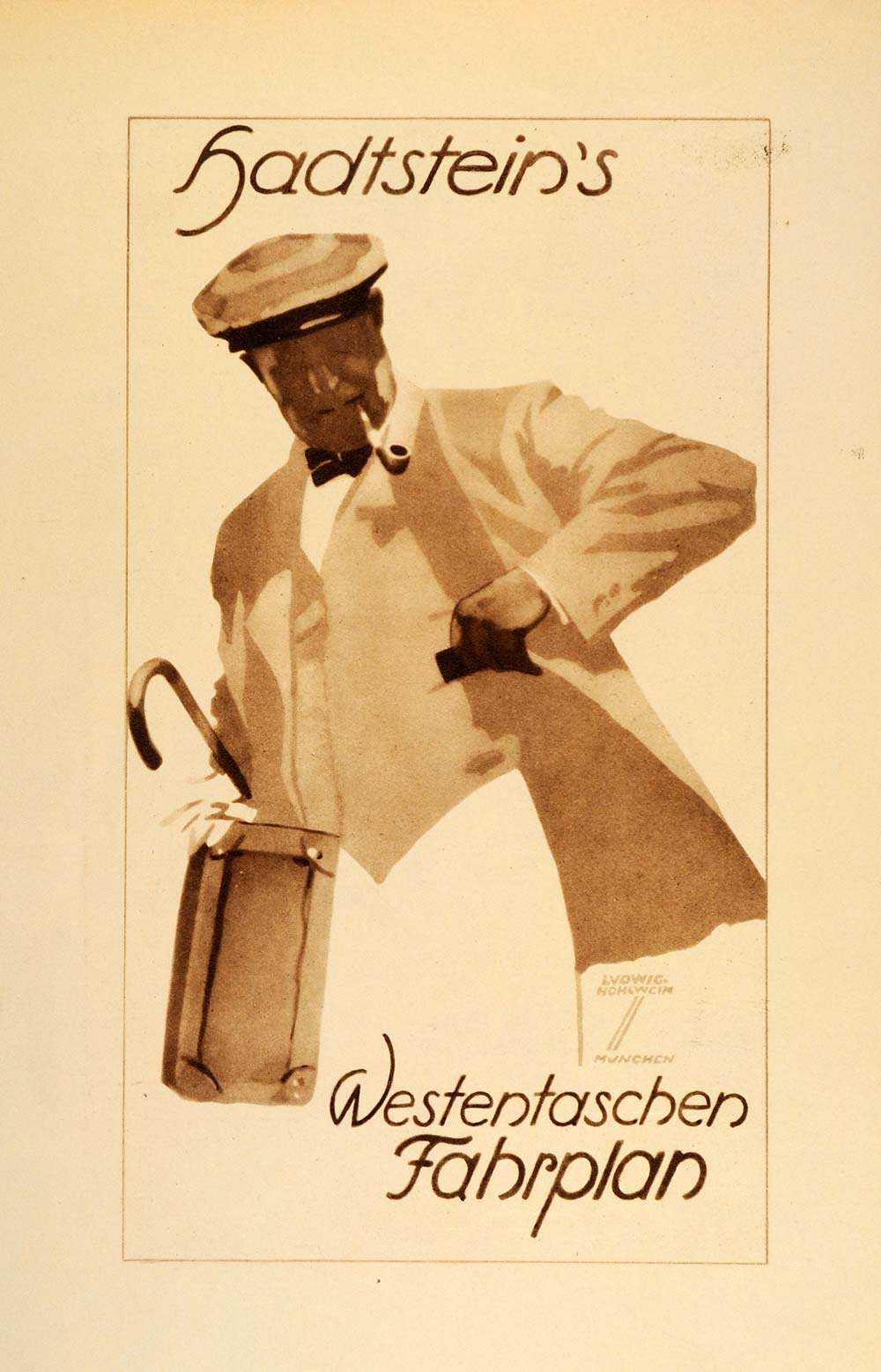 This is an original 1926 photogravure of an advertising poster by Ludwig Hohlwein. This poster advertises the clothier's vest pockets, which appear to be the perfect size for a timetable. (Please note that there is printing on the reverse.)