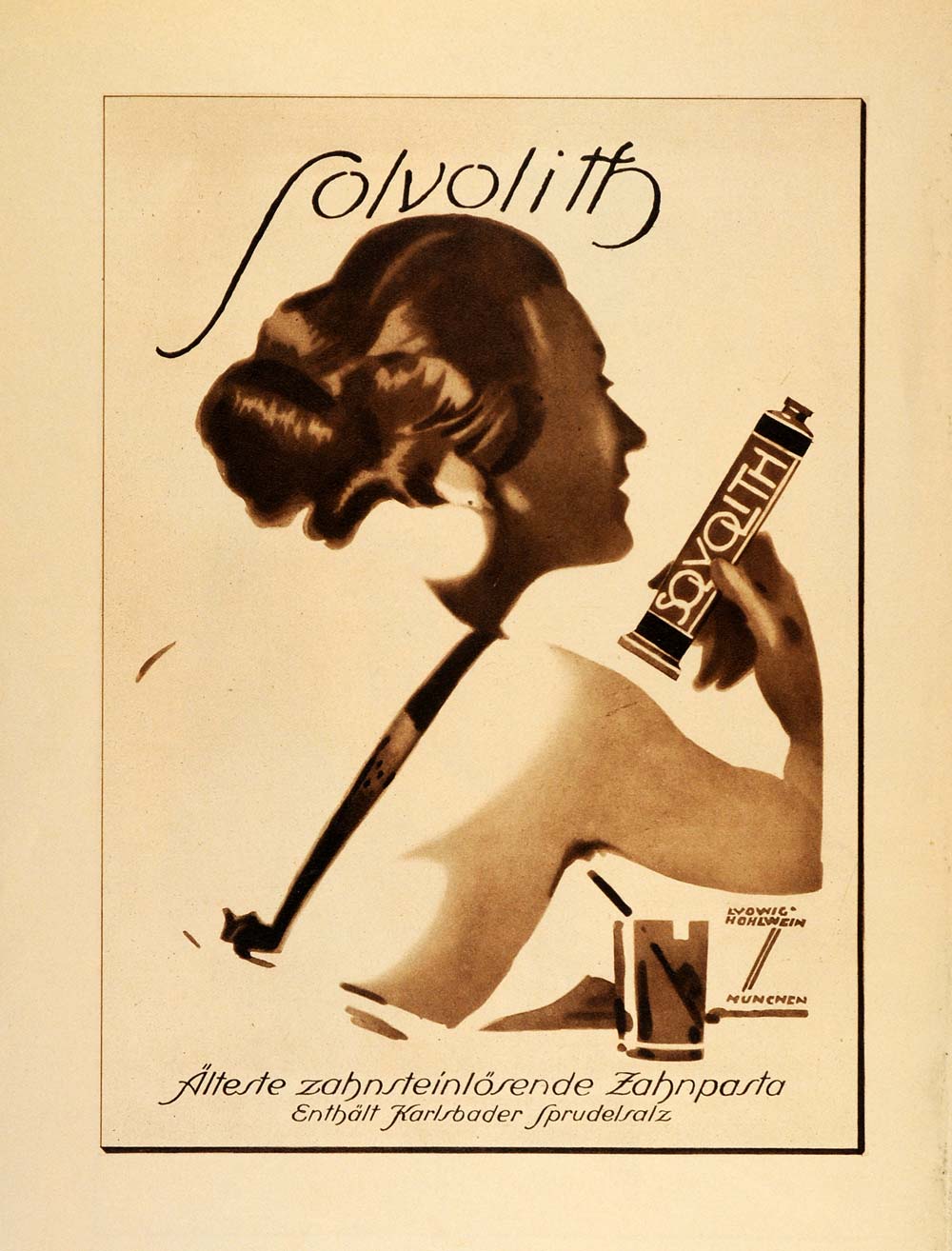 This is an original 1926 photogravure of an advertising poster by Ludwig Hohlwein for Solvolith Toothpaste. (Please note that there is printing on the reverse.)