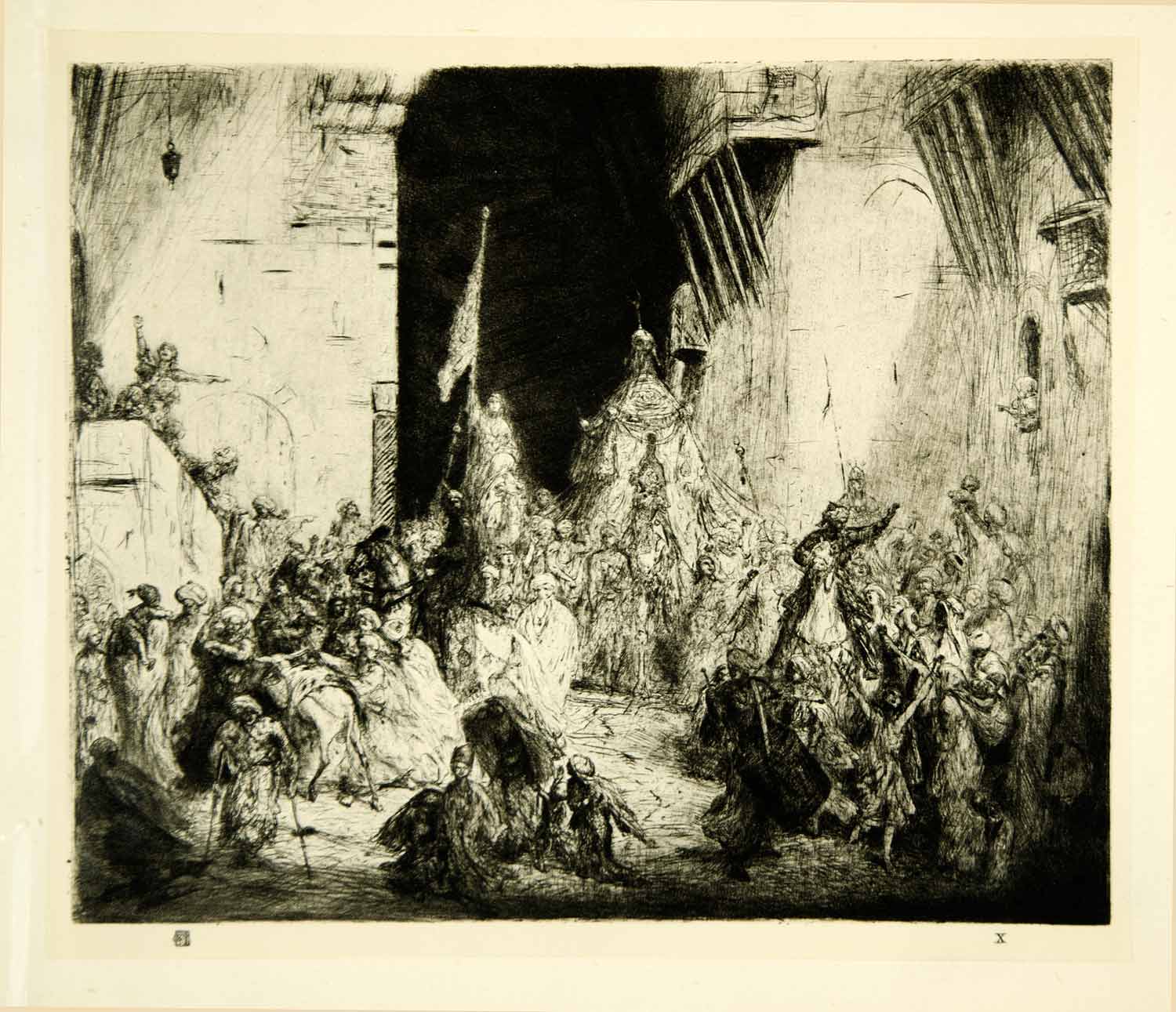 This is an original 1926 tipped-in black and white photogravure of an etching by the Dutch painter and printmaker, Marius Bauer (1867-1932) of the Holy Camel returning from the pilgrimage to Mecca and parading through a festive crowd in the streets of Cairo.