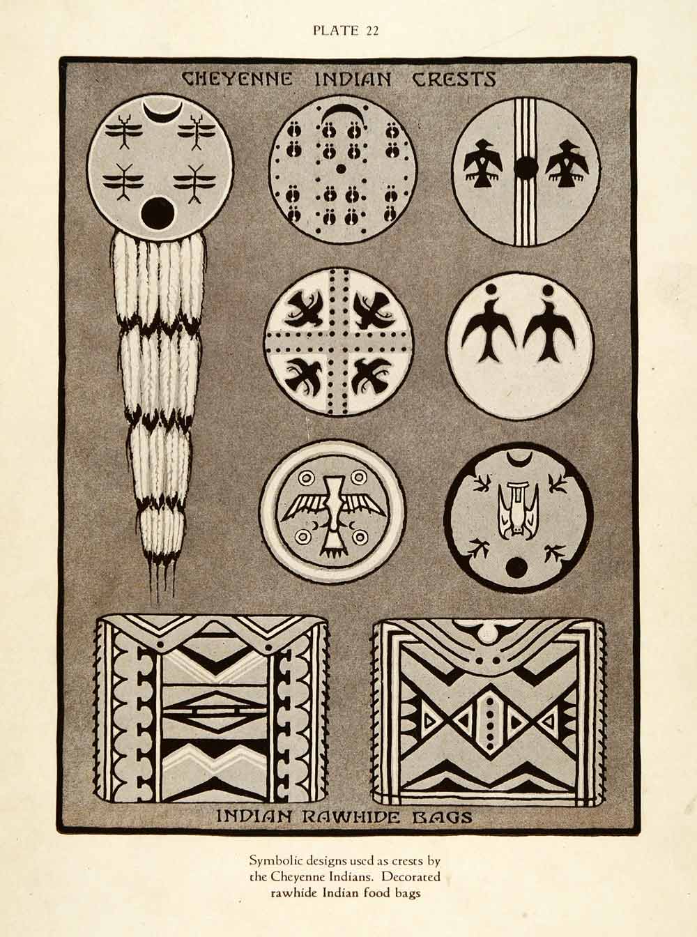 This is an original 1926 sepia photolithograph of designs used as crests by the Cheyenne Indians and decorated Indian food bags that were used for food.