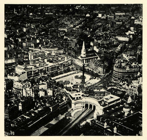 This is an original 1926 halftone print of a bird's eye view of Trafalgar Square in London, England. In the foreground the Admiralty Arch may be seen.