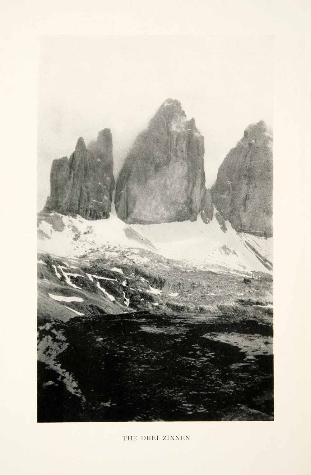 This is an original 1926 black and white halftone print of "The Drei Zinnen," in the Dolomites of Northeast Italy.