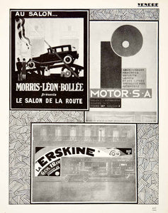 This is an original 1926 black and white halftone print which depicts three examples of French automobile-related advertising. Clockwise from the top left: Le Salon de la Route, presented by Morris-Léon-Bollée; Motor S.A.; Erskine by Studebaker.