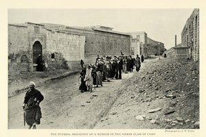 This is an original 1926 halftone print of a funeral procession in Cairo, Egypt. The men and women walked down the street and recited verses from the Qur'an. Photography by A. W. Cutler.
