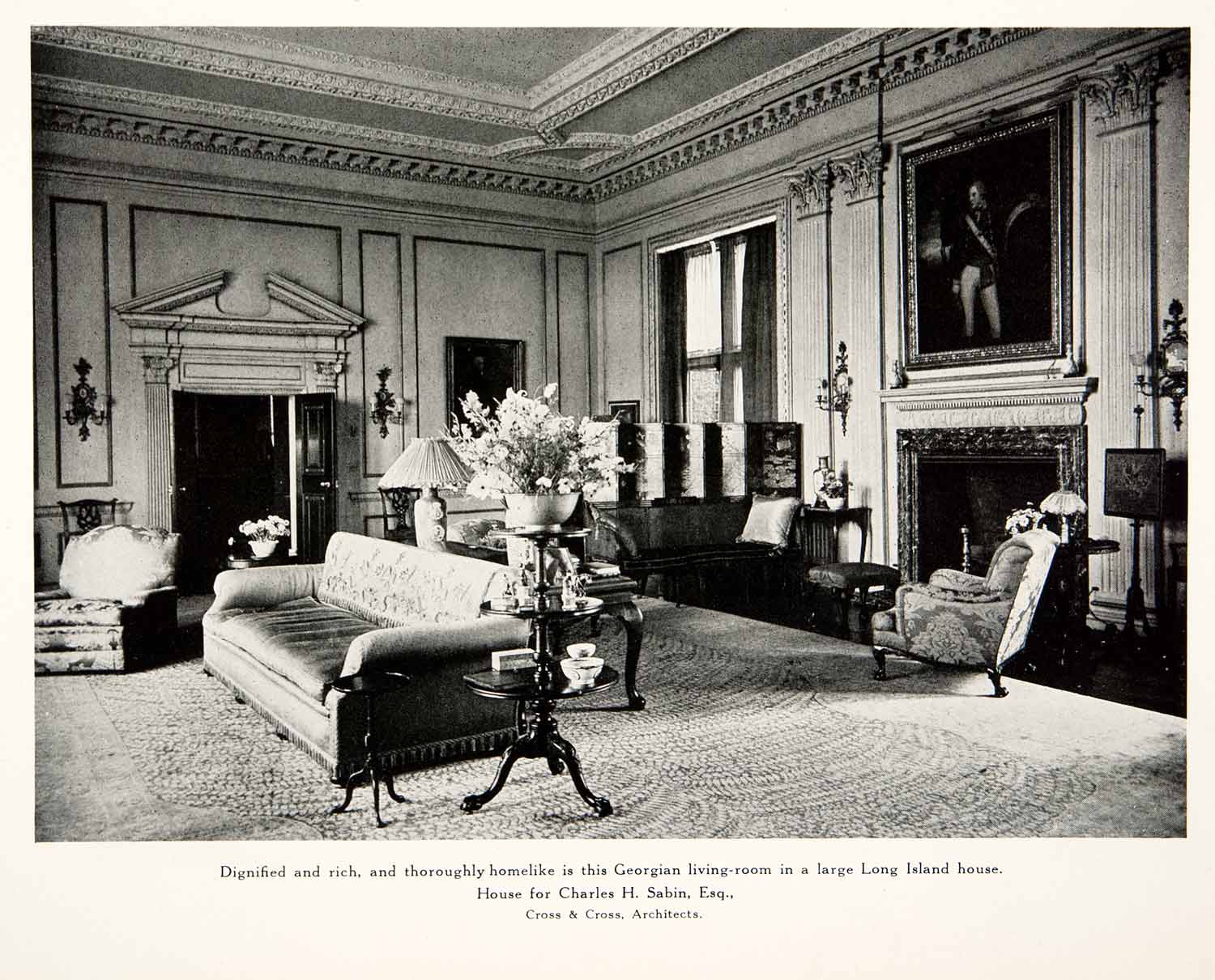 This is an original 1926 black and white halftone print of a Georgian living room in the Long Island home of Charles H. Sabin, Esq. It was designed by Cross & Cross Architects.