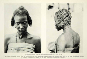 This is an original 1926 black and white halftone print of two women's hairstyles from tribes on the shores of Lake Chad in Africa.