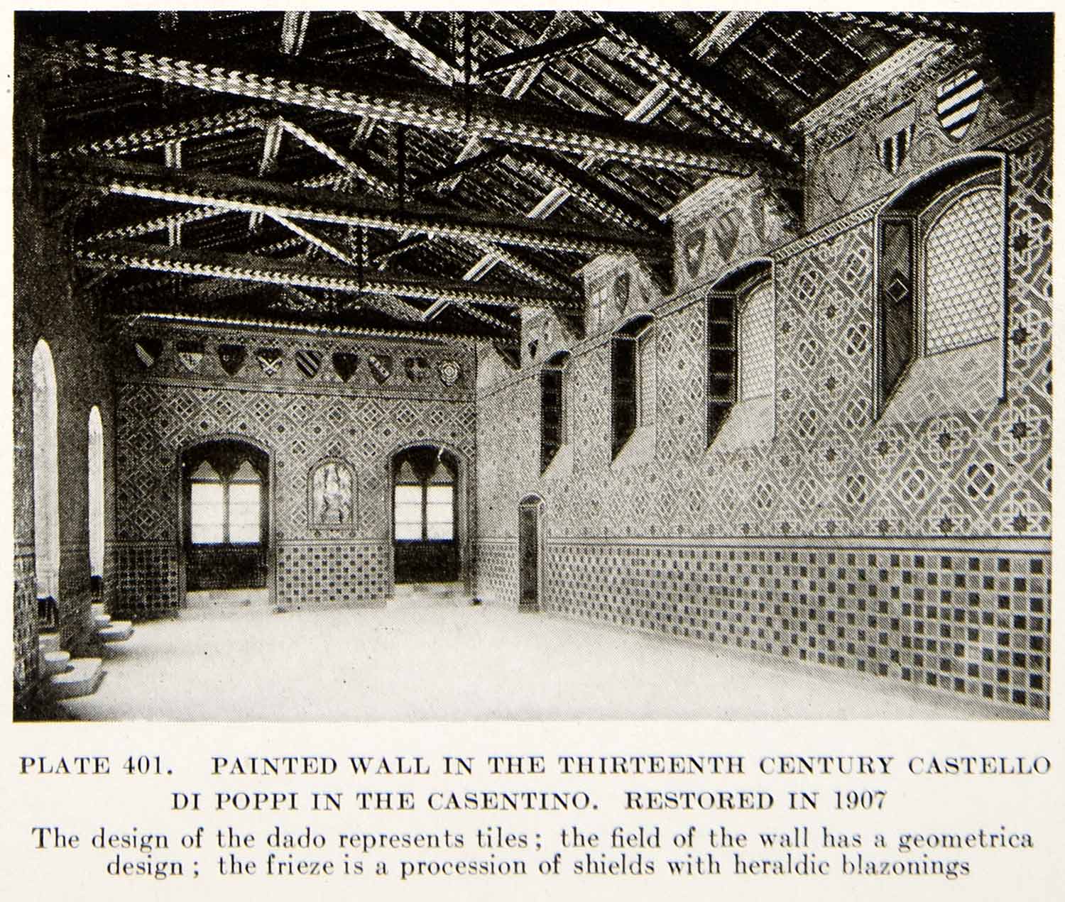 This is an original 1926 black and white halftone print of a painted wall in the 13th century Castello di Poppi in the Casentino.