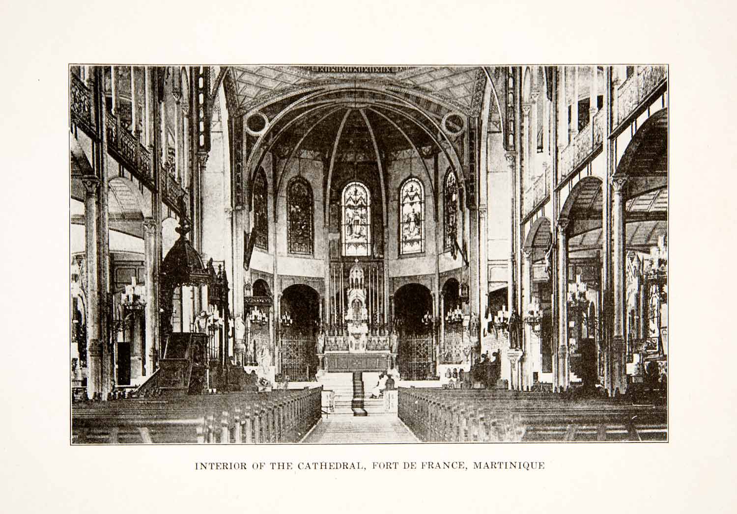This is an original 1926 black and white halftone print of the interior of the Roman Catholic Cathedral in the city of Fort De France located on the island of Martinique in the Caribbean.