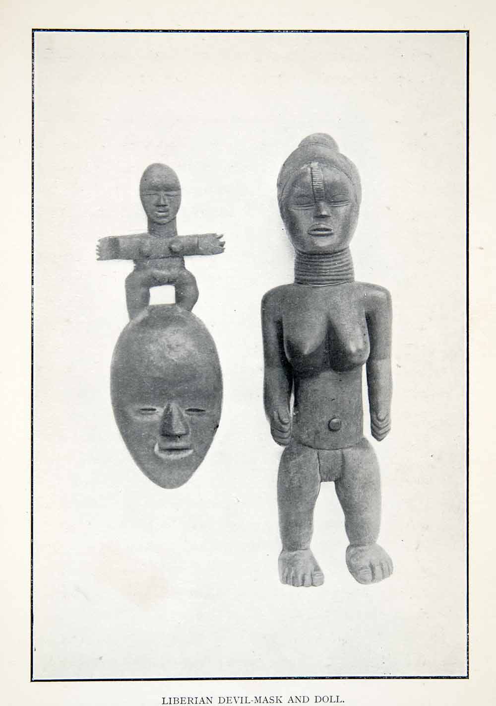 This is an original 1926 black and white halftone print of "Liberian Devil-Mask and Doll."