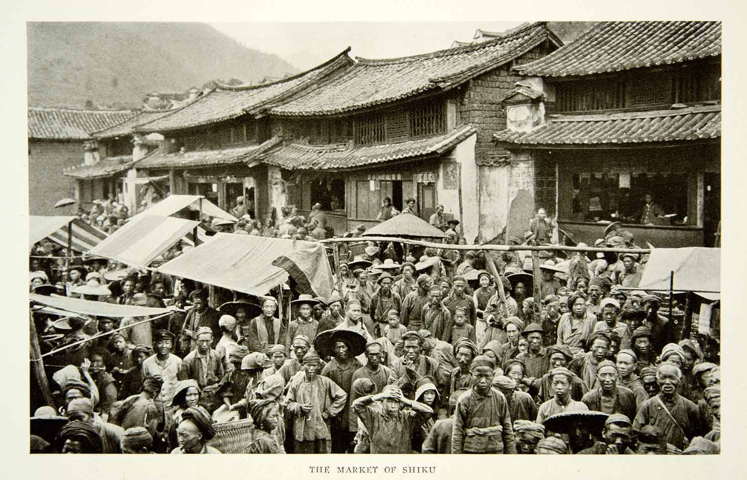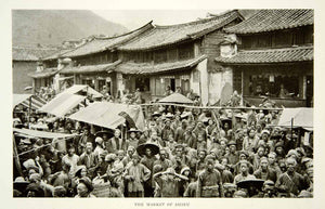 This is an original 1926 black and white halftone print of the busy marketplace in the Chinese city of Shiku.