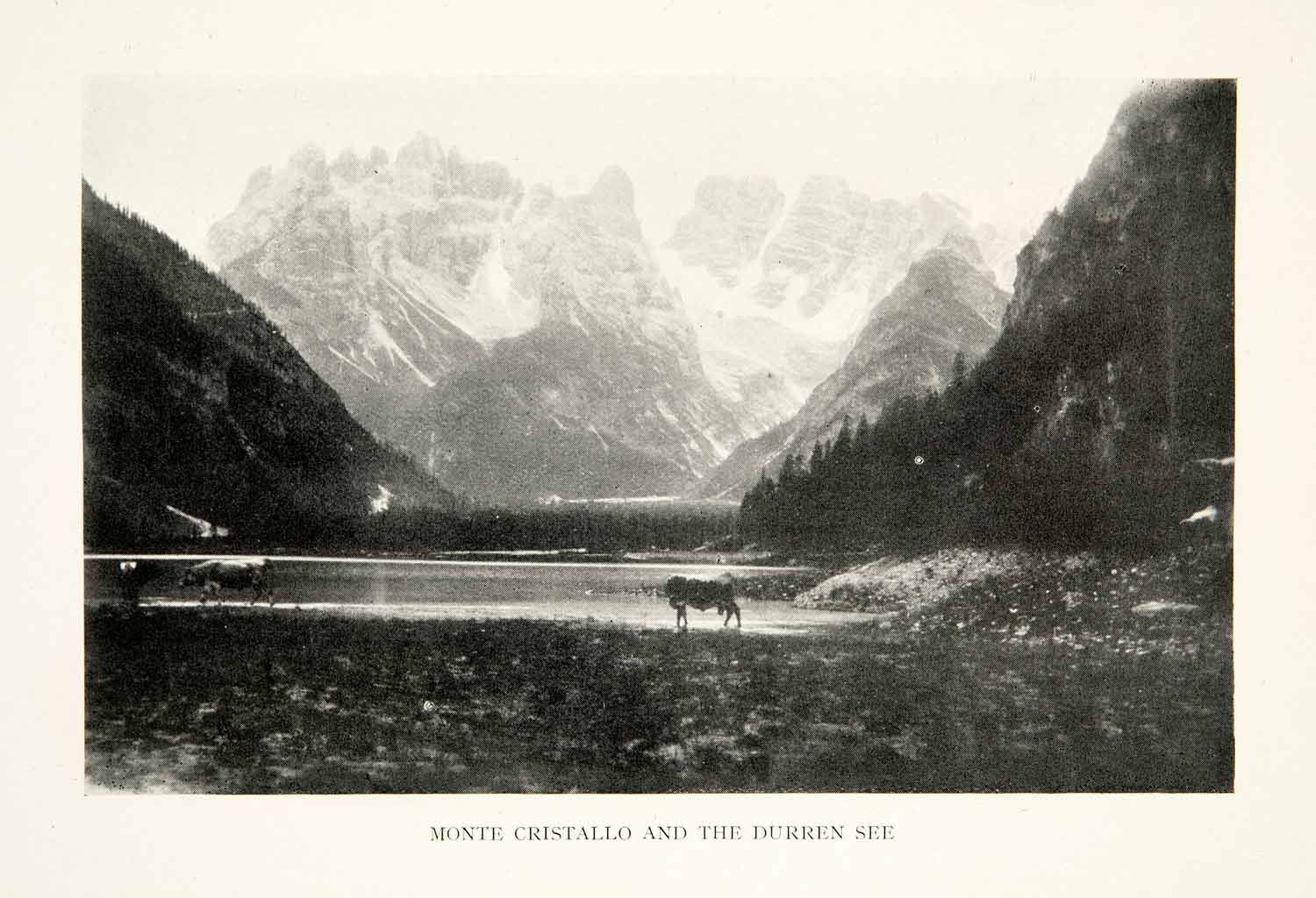 This is an original 1926 black and white halftone print of "Monte Cristallo and the Durren See," in Italy.