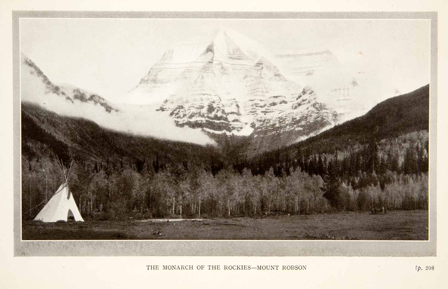 This is an original 1926 black and white halftone print of the "monarch of the Rockies"- Mount Robson in the Mount Robson Provincial Park in British Columbia, Canada.