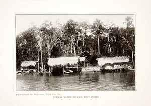 This is an original 1926 black and white halftone print of traditional native huts located along the shores of the ocean on the Caribbean islands of the West Indies chain.