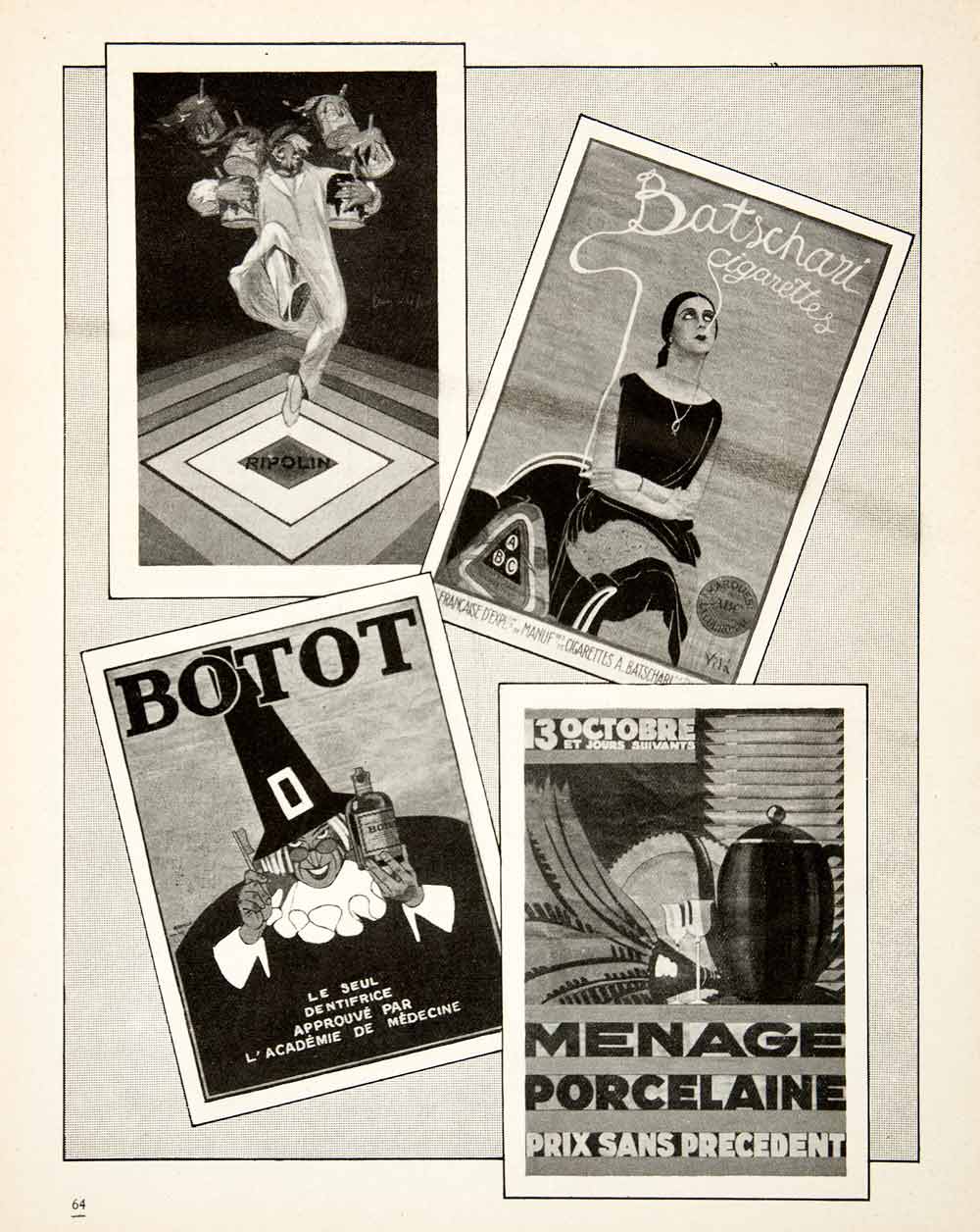 This is an original 1926 black and white halftone print of four unique French advertisements from the era of art deco. Clockwise from the top left: Ripolin paint; Batschari Cigarettes; a porcelain sale; Botot Toothpaste.