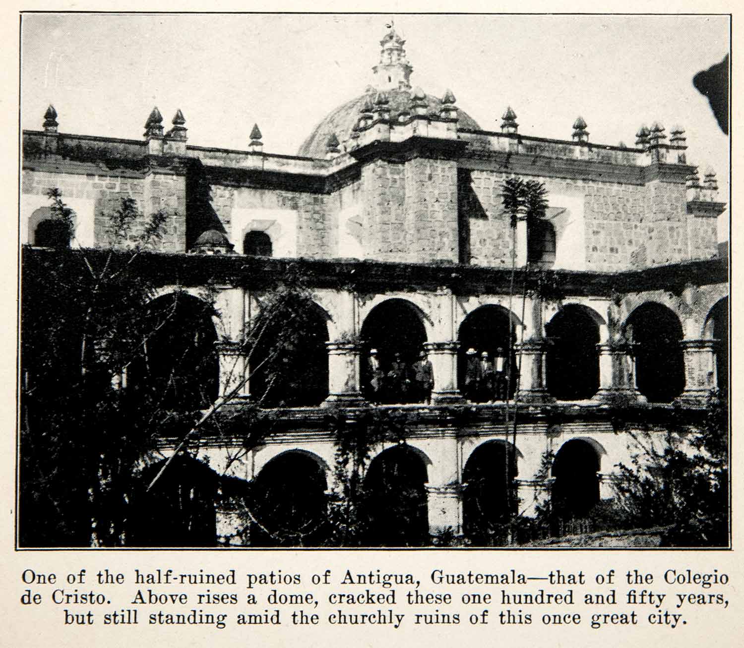 This is an original 1926 black and white halftone print of a ruined patio of Colegio de Cristo in Antigua, Guatemala.