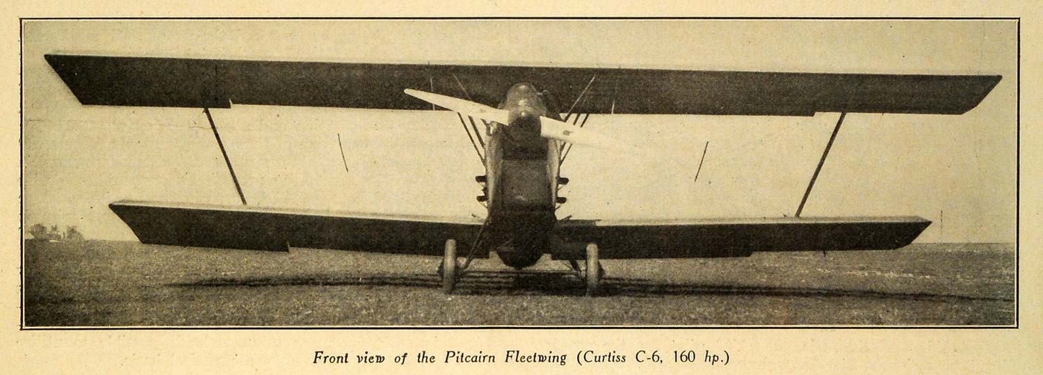 This is a set of two original 1926 halftone prints of the Pitcairn Fleetwing (Curtiss C-6, 160 h. p. engine). The fist image shows the Pitcairn Fleetwing biplane. The second image shows the front view of the Pitcairn Fleetwing.