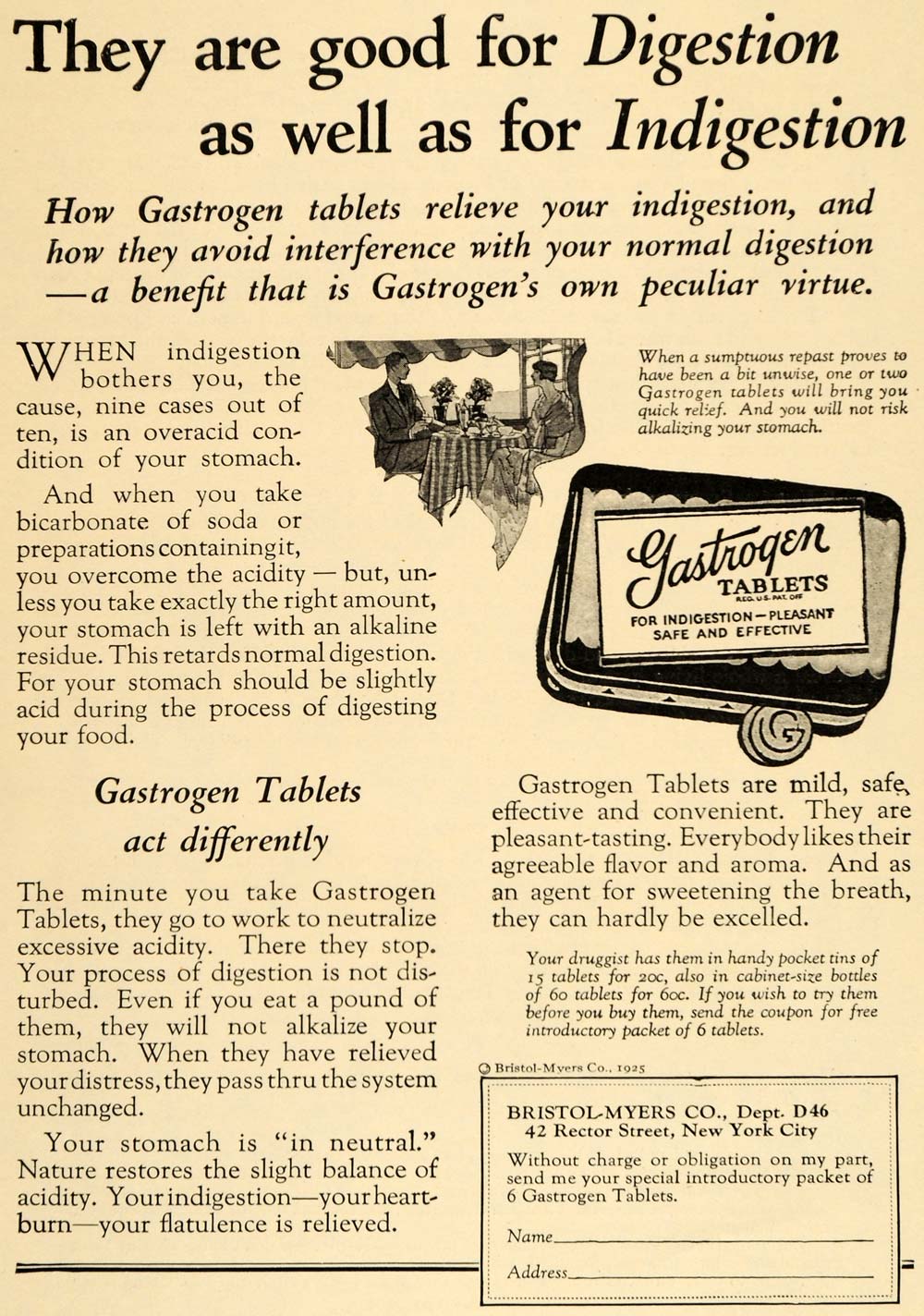 This is an original 1926 black and white print ad for Gastrogen Tablets-- an antacid treatment for indigestion from Bristol-Myers Co., 42 Rector Street, NYC.
