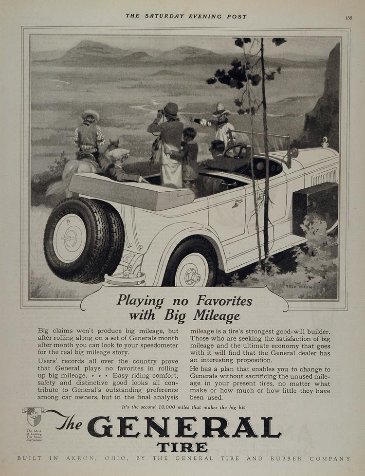 This is an original 1926 black and white print ad for Firestone General Tires with a nice illustration of a western landscape scene.