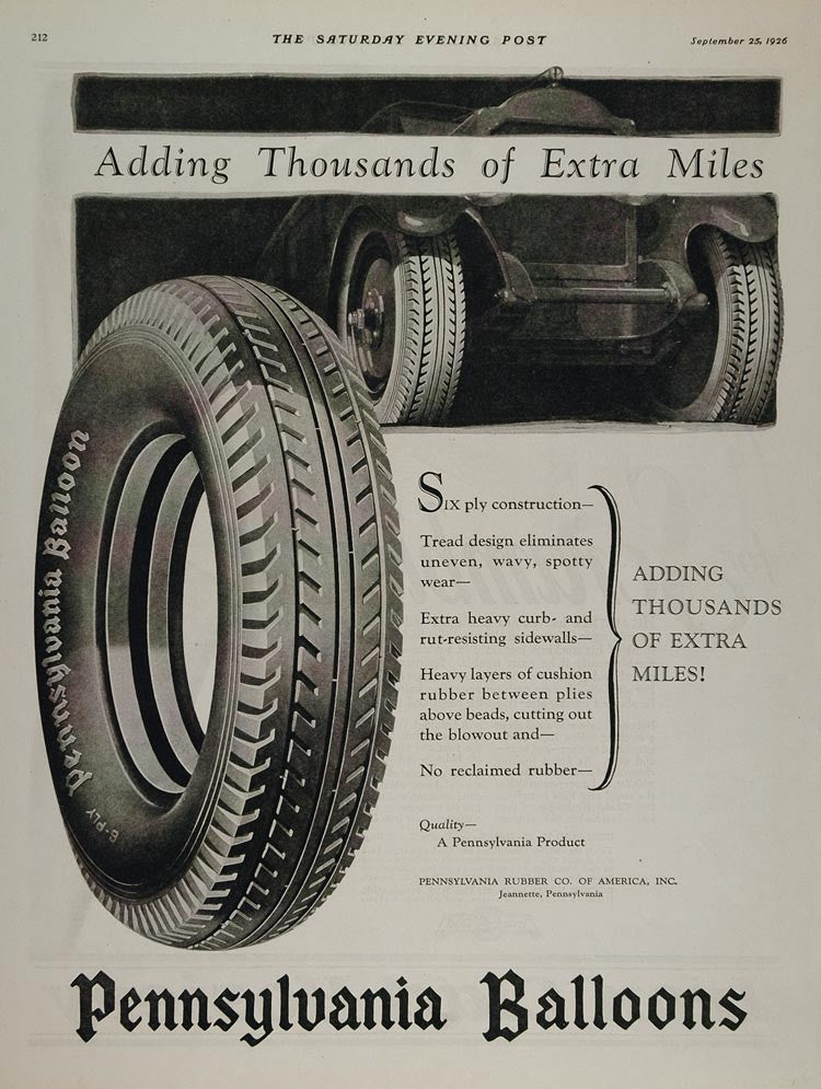 This is an original 1926 black and white print ad for Pennsylvania Balloon Automobile Tires from the Pennsylvania Rubber Co. of America, Inc., Jeannette, Pennsylvania.