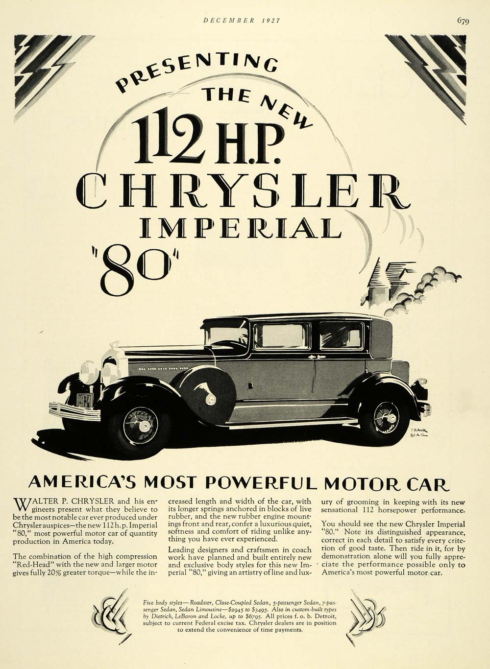 This is an original 1927 black and white print ad for the 112 Horsepower Chrysler Imperial "80" automobile. This ad features artwork by Frank Quail.
