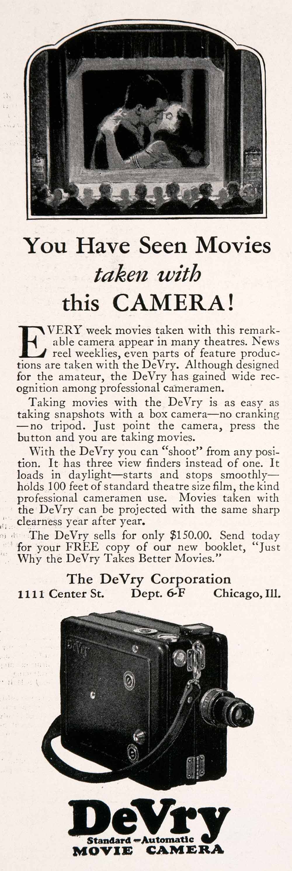 This is a small original 1927 black and white print ad for the DeVry Standard Automatic Movie Camera, a product line by The DeVry Corporation, located at 1111 Center Street in Chicago.