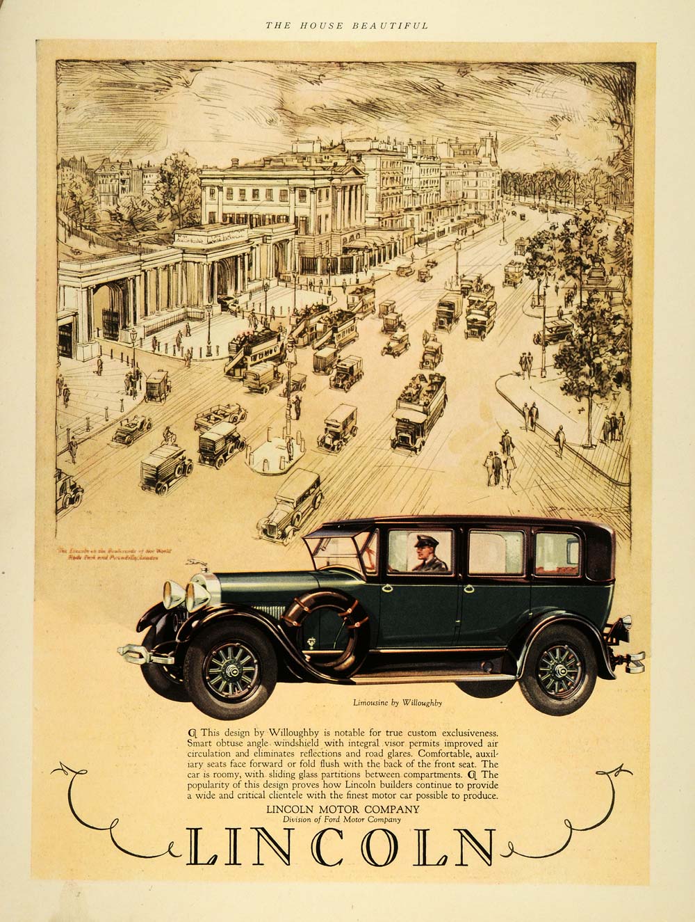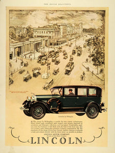 This is a stunning rare original 1927 color print ad for the Lincoln Motor Car, specially featuring the Limousine by Willoughby. This ad features an image of the streets of Hyde Park and Piccadilly in London.