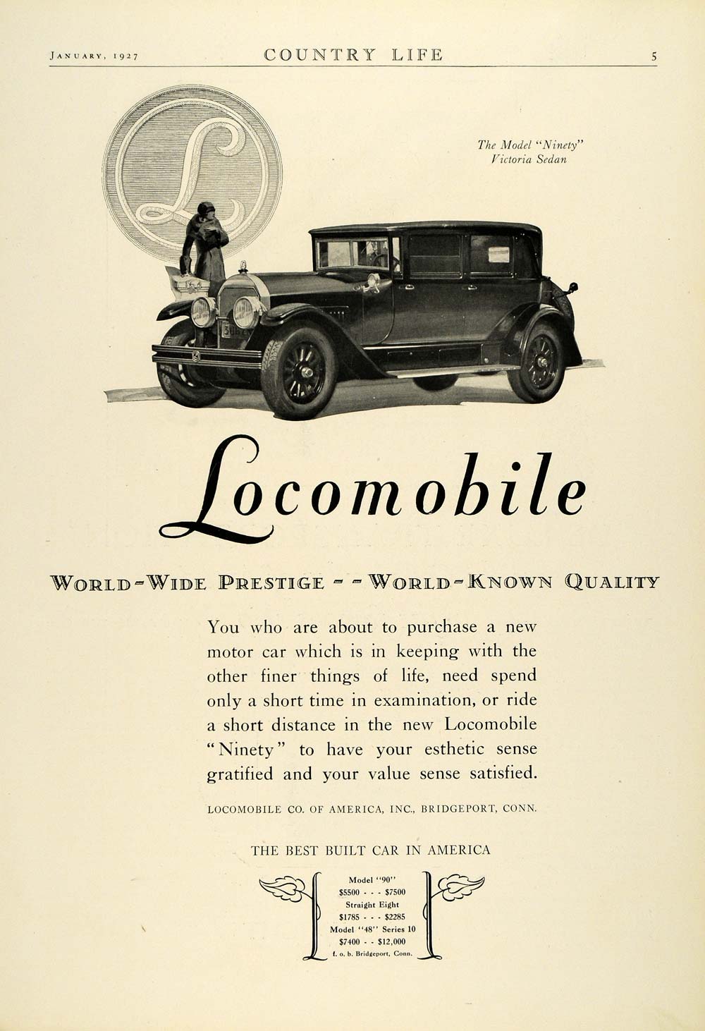 This is an original 1927 black and white print ad for the Locomobile Company of America, Inc. of Bridgeport, Connecticut. This particular ad features an image of The Model "Ninety" Victoria Sedan.