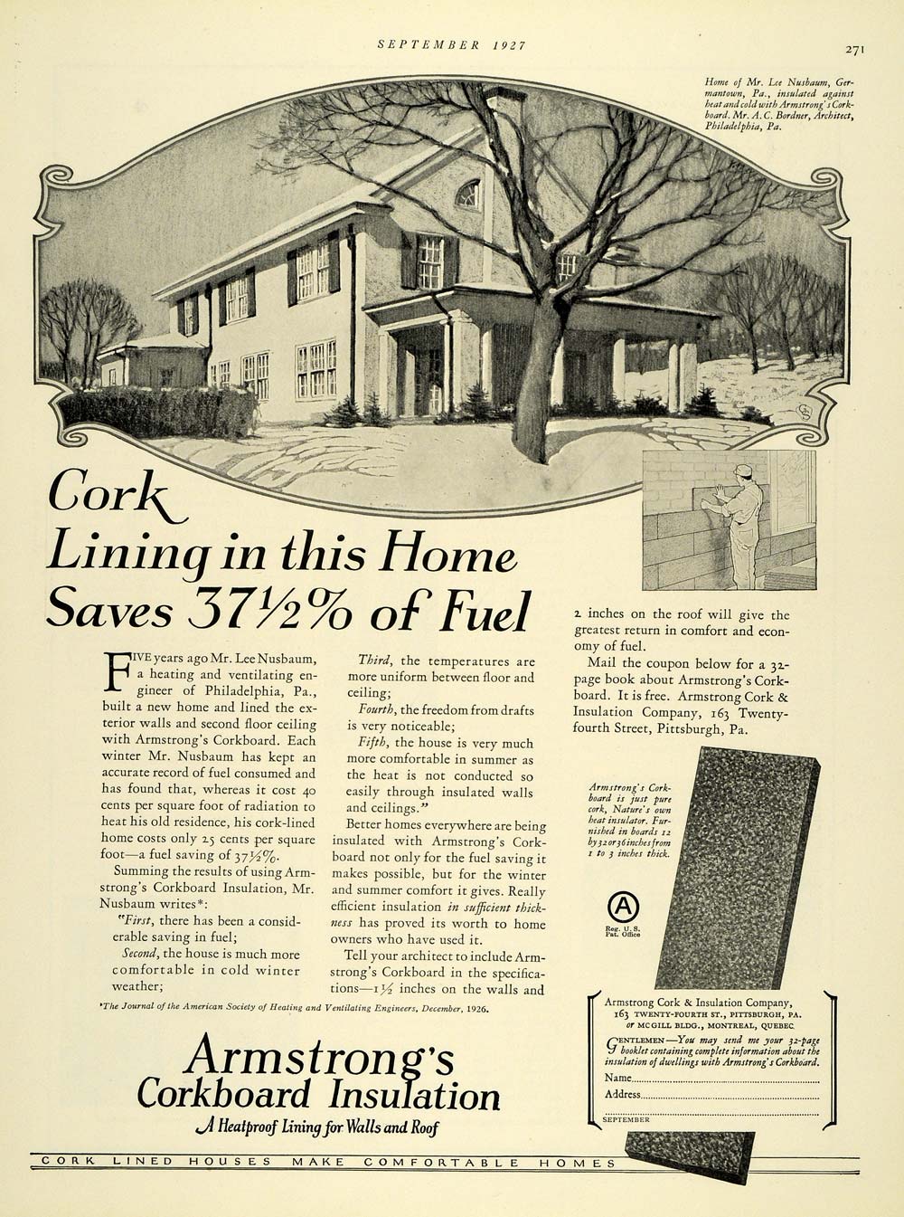 This is an original 1927 black and white print ad for Armstrong's Corkboard Insulation, a heatproof lining for walls and roofs.