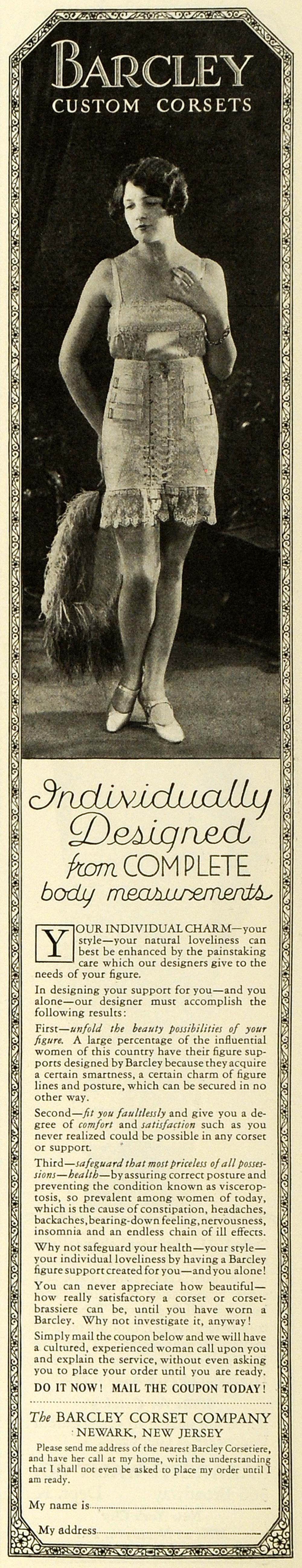 This is a small original 1927 black and white print ad for Barcley Custom Corsets, a product by The Barcley Corset Company in Newark, New Jersey.