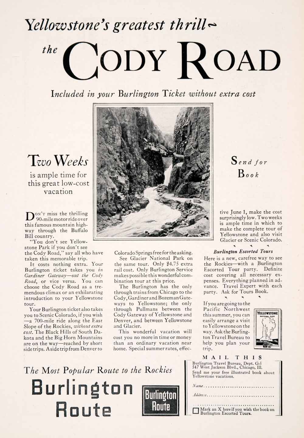 This is an original 1927 black and white print ad for the Burlington Route. Shown in the illustration is an image of Cody Road in Yellowstone National Park.