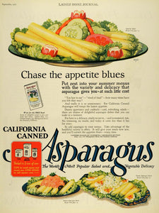 This is an original 1927 color print ad for California Canned Asparagus from the Canners League of California, located at 451 Montgomery Street in San Francisco.