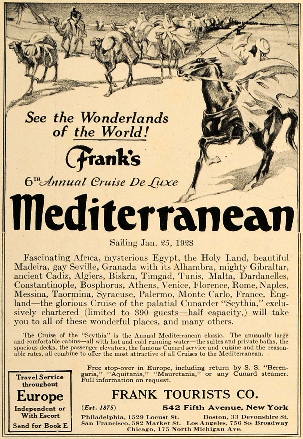 This is an original 1927 black and white print ad for the 6th Annual Cruise De Luxe Mediterranean vacation by Frank Tourists Company located at 542 Fifth Avenue, New York City. Cruise by Cunard steamers S. S. "Berengaria," "Awuitania" and "Mauretania."