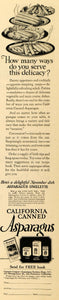 This is an original 1927 black and white print ad for the California Canned Asparagus from Canners League located at 451 Montgomery Street, San Francisco, California.