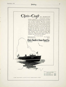 This is an original 1927 black and white print ad for the Chris-Craft all-mahogany runabout racing speedboats that were made and sold by the Chris Smith & Sons Boat Company of Algonac, Michigan (MI) during the Roaring Twenties era.