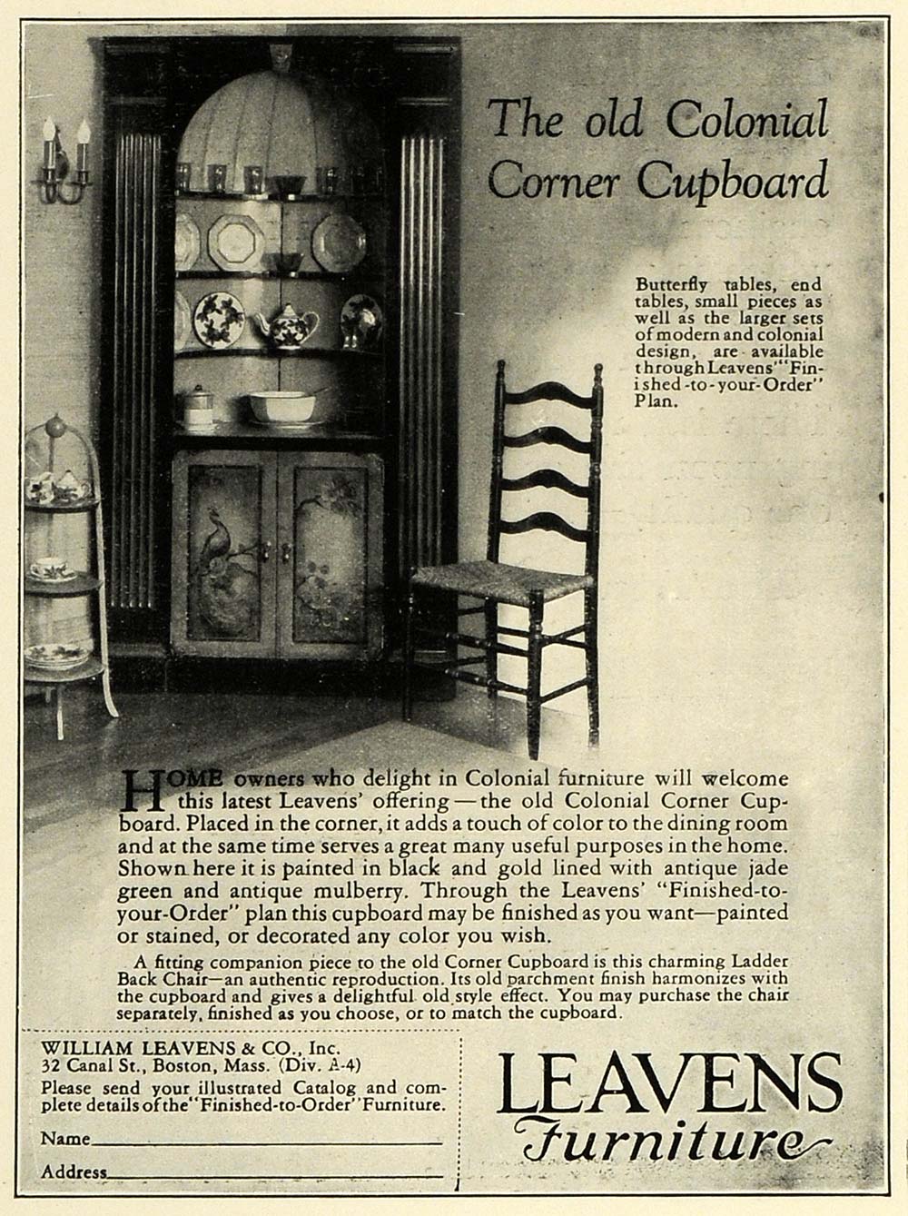 This is an original 1927 black and white print ad for the William Leavens & Company's line of furniture. This ad specially features an old Colonial Corner Cupboard.