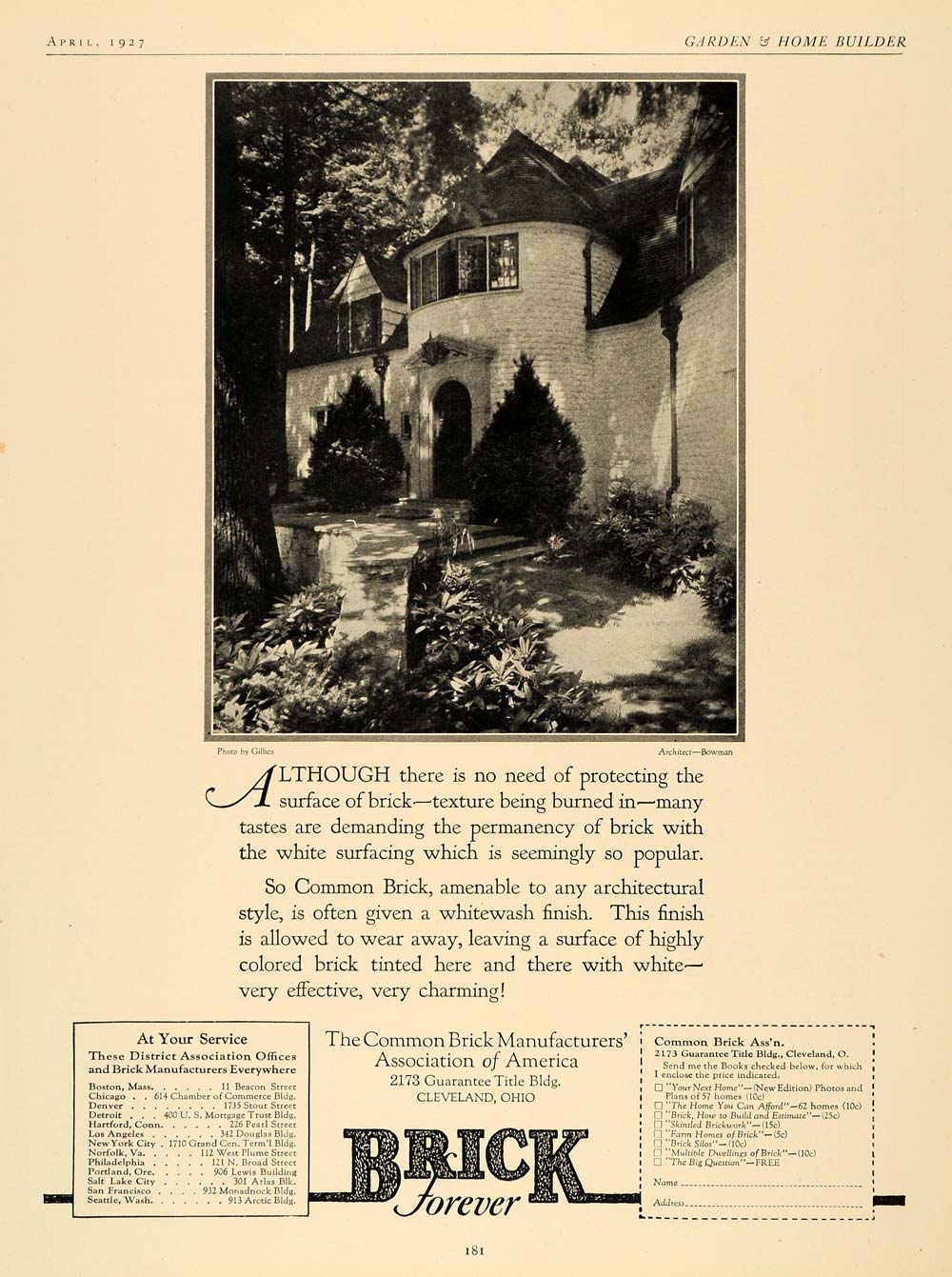 This is an original 1927 black and white print ad for the Common Brick Manufacturers' Association of America located at 2173 Guarantee Title Building, Cleveland, Ohio. Photo by Gillies.