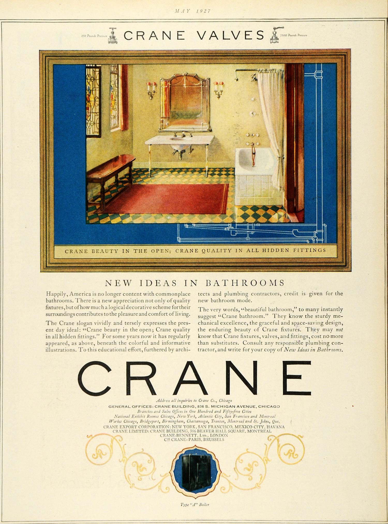 This is an original 1927 color print ad for Crane valves and fixtures from the Crane Company of 836 S. Michigan Avenue, Chicago, Illinois.