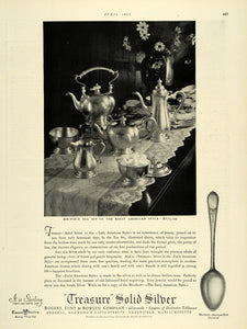 This is an original 1927 black and white print ad for the Rogers, Lunt & Bowlen Company's line of Treasure Solid Sterling Silver. This ad specially features a 6 piece tea set in Early American Style.