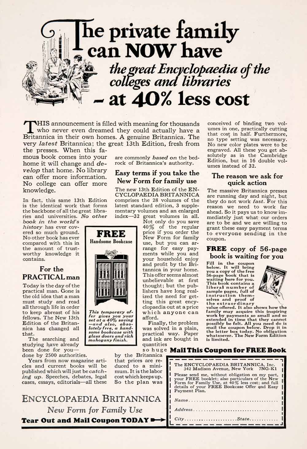 This is an original 1927 black and white print ad for the Encyclopedia Brittanica of 342 Madison Avenue, New York.