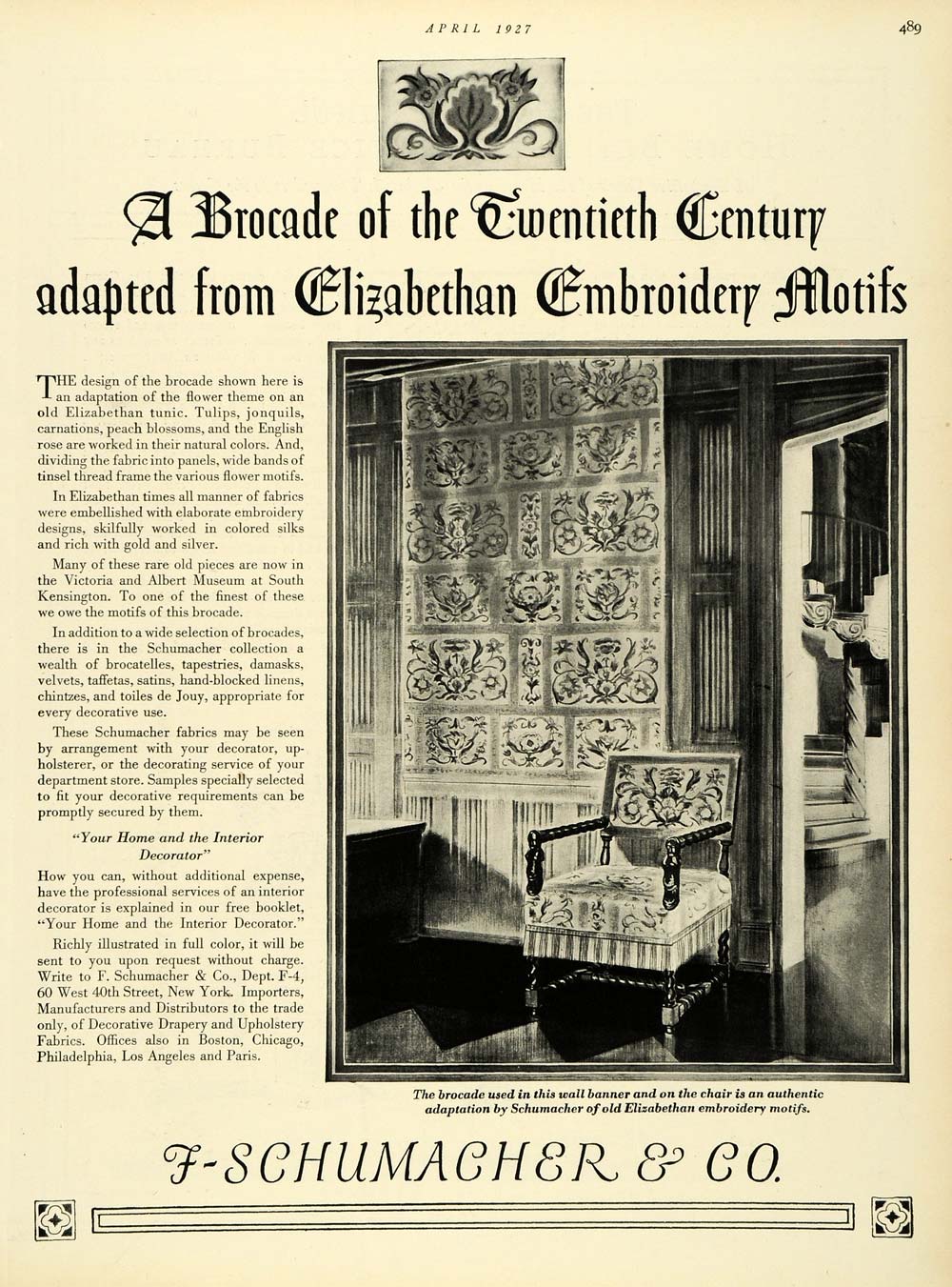 This is an original 1927 black and white print ad for home decor from F. Schumacher & Company of 60 West 40th Street, New York. Shown in the illustration is a brocade adapted by Schumacher of an Elizabethan embroidered tapestry.