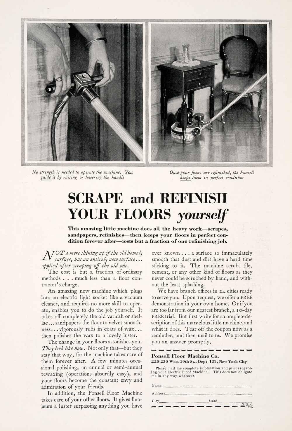 This is an original 1927 black and white print ad for the Ponsell Floor Machine Company of 220 West 19th Street, New York City.