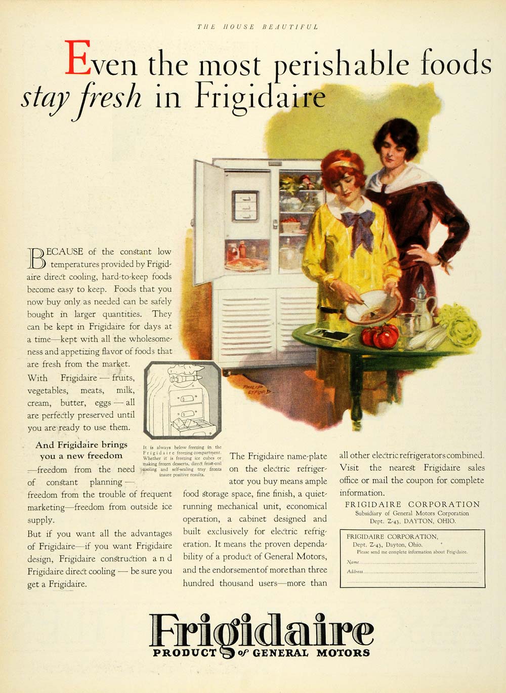 This is an original 1927 color print ad for refrigerator units from the Frigidaire Corporation of Dayton, Ohio. Shown in the illustration are two women making a recipe together.