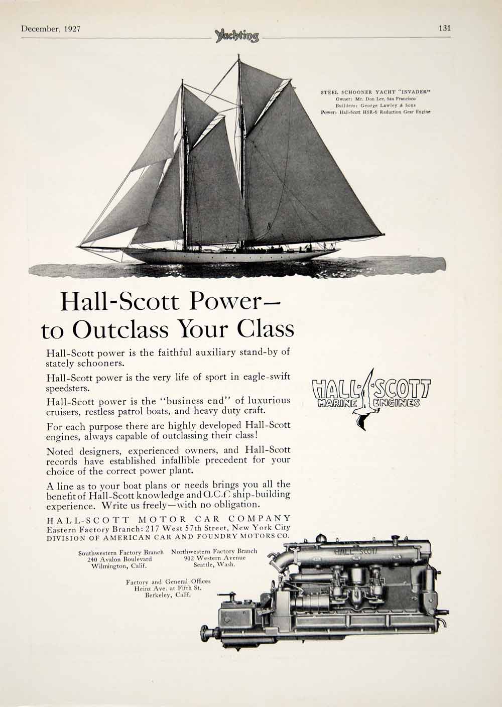 This is an original 1927 black and white print ad for marine engines that were made and sold by the Hall-Scott Motor Car Company of 217 West 57th Street, New York, NY during the Roaring Twenties era. The ad also features a photograph of the steel schooner yacht, Invader, that was built by George Lawley & Sons, owned by Don Lee of San Francisco, California (CA), and powered with a Hall-Scott HSR-6 Reducation Gear Engine.