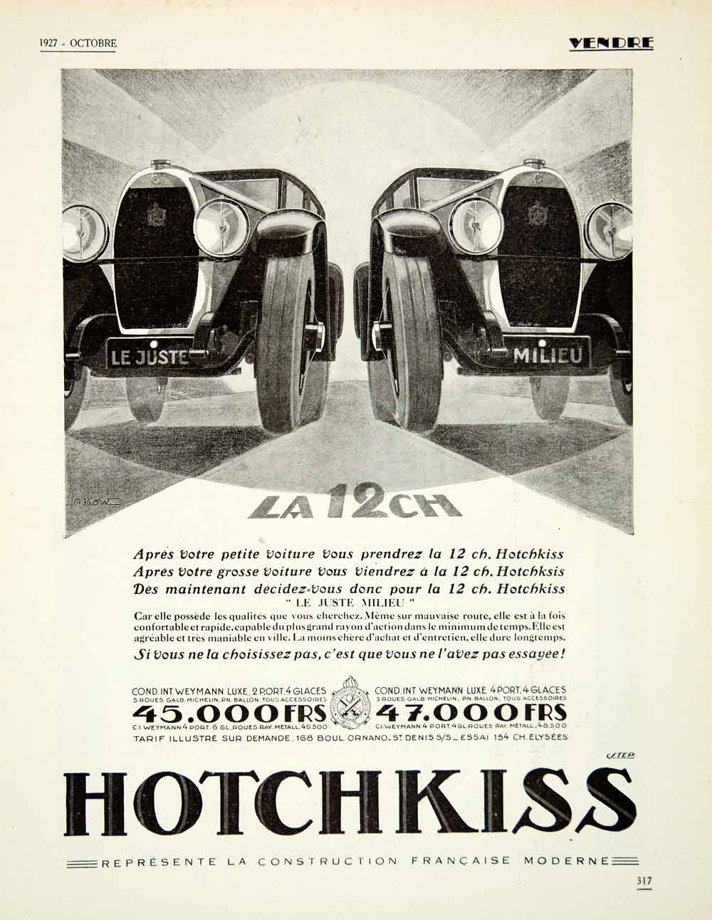 This is an original 1927 black and white print ad for Hotchkiss automobiles. Inquiries could be addressed to 168 Boulevard Ornano, St. Denis, Paris.