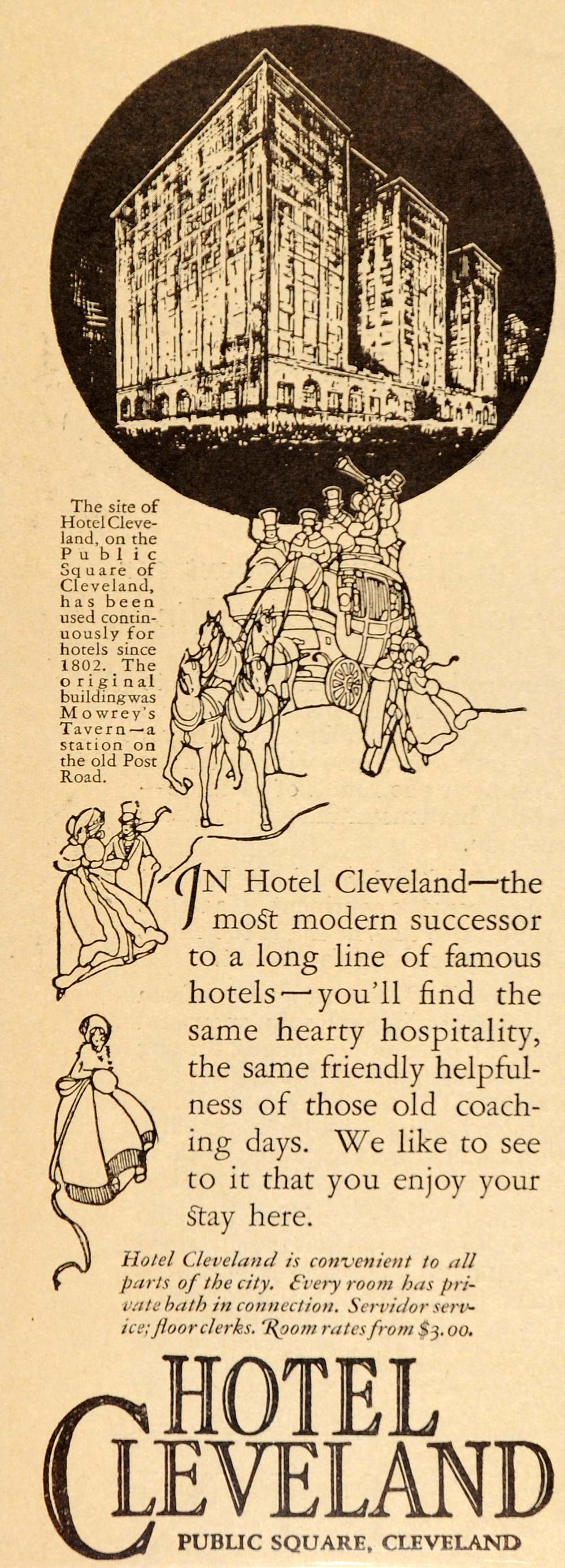 This is an original 1927 black and white print ad for the Hotel Cleveland on the Public Square in Cleveland, Ohio, which is now the Renaissance Cleveland Hotel.
