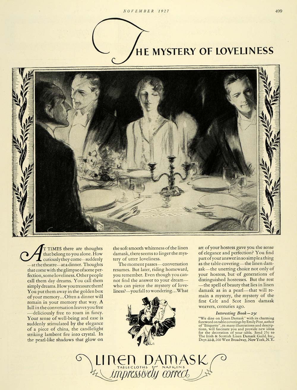 This is an original 1927 black and white print ad for Linen Damasks by The Irish and Scottish Linen Damask Guild, located at 260 West Broadway in New York City.