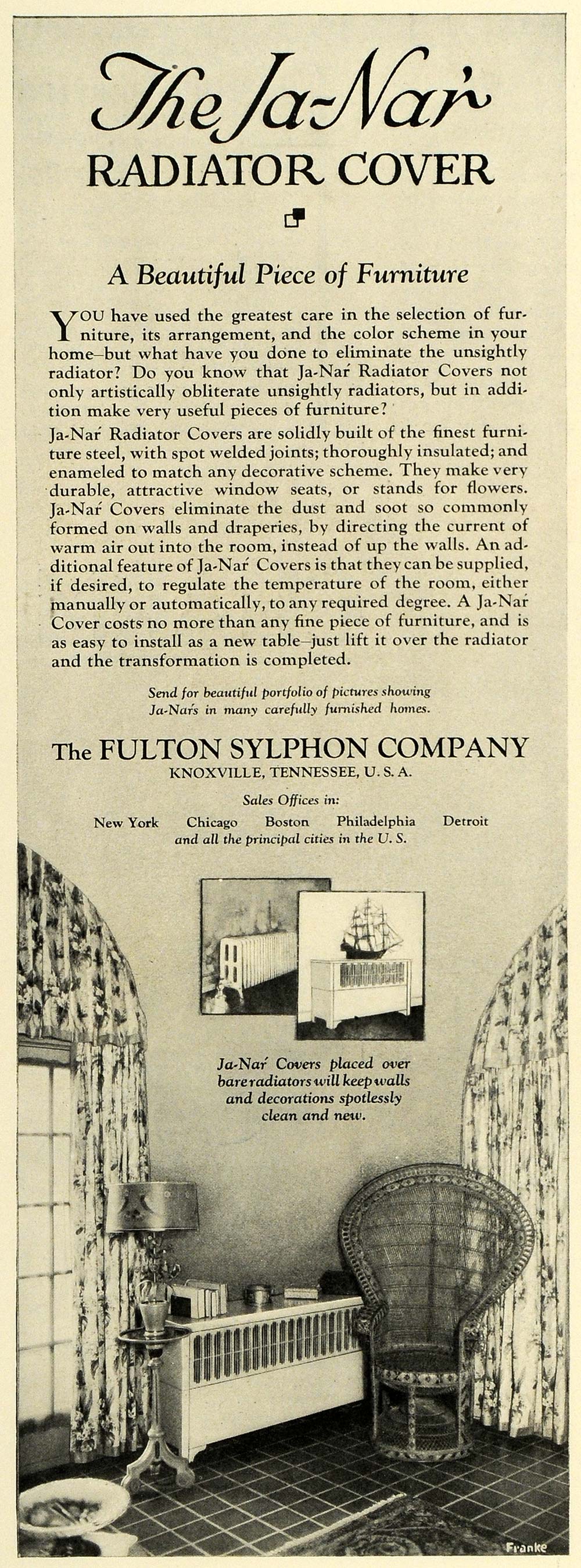 This is an original 1927 black and white print ad for the Ja-Nar Radiator Cover, a product line by The Fulton Sylphon Company in Knoxville, Tennessee. This ad features artwork by Franke.