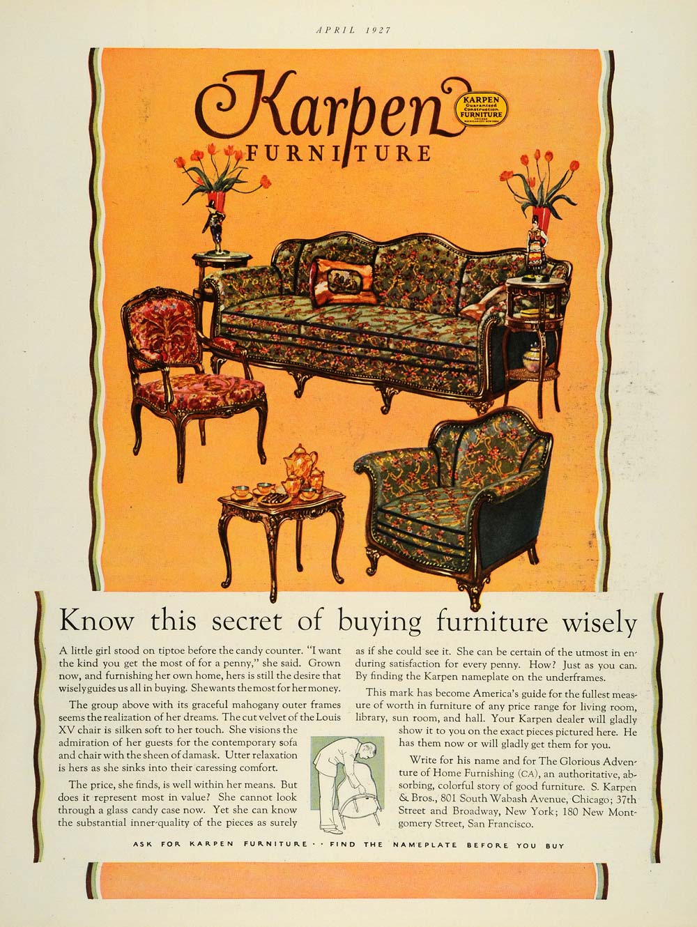 This is an original 1927 color print ad for S. Karpen and Bros. Furniture Company, located at 801 South Wabash Avenue in Chicago.