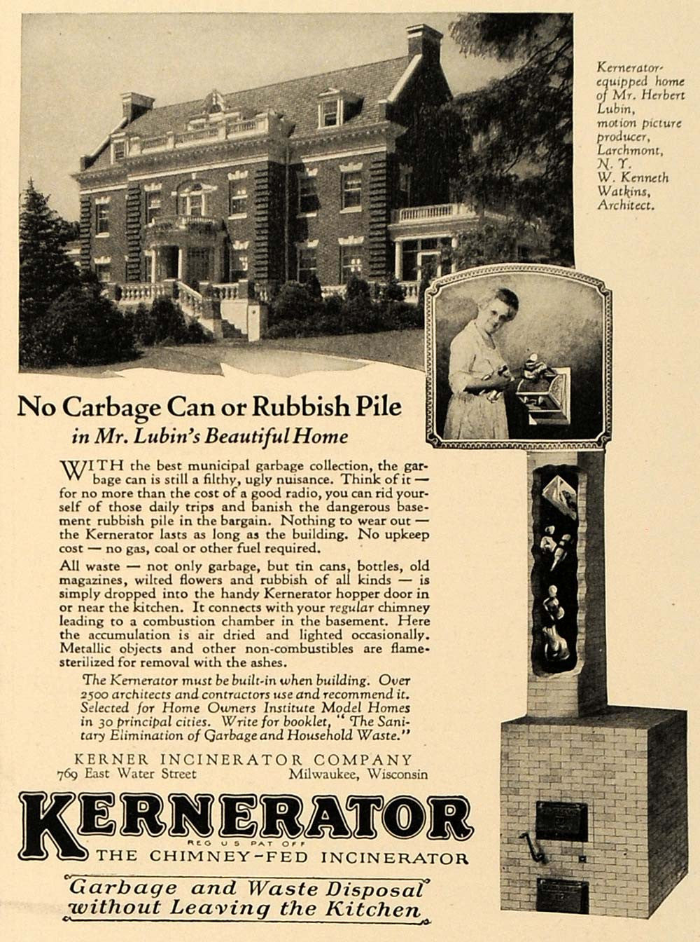 This is an original 1927 black and white print ad for the Kernerator, The Chimney-Fed Incinerator for garbage and waste disposal, a product by Kerner Incinerator Company, located at 769 East Water Street in Milwaukee, Wisconsin. This ad features an image of the home of motion picture producer Herbert Lubin with architecture by W. Kenneth Watkins.